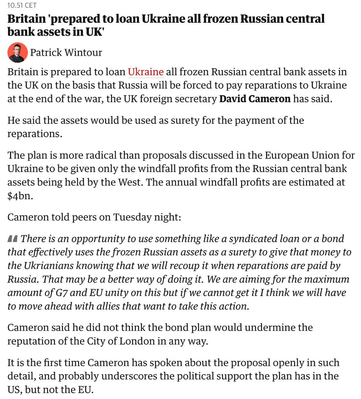 "Есть возможность использовать что-то вроде синдицированного кредита или облигаций, которые фактически используют замороженные российские активы в качестве поручительства, чтобы дать эти деньги украинцам, зная, что мы вернем их, когда Россия выплатит репарации. Возможно, это лучший способ сделать это", - заявил Кэмерон своим коллегам.