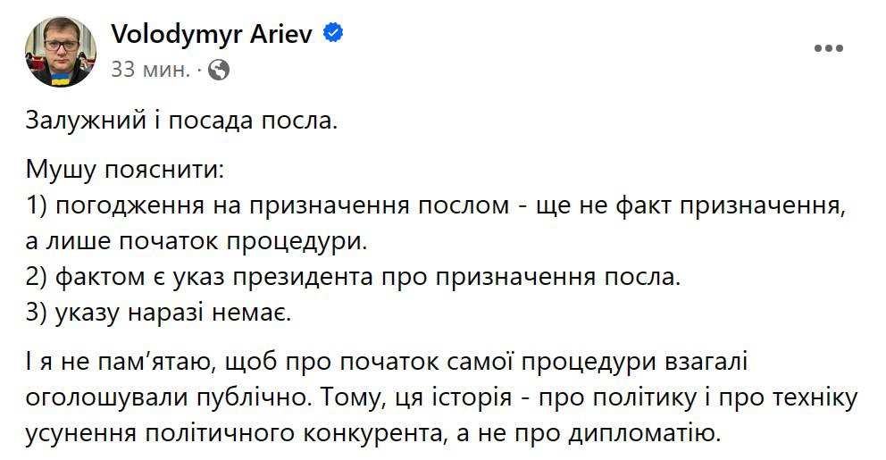 "Согласование на назначение послом – еще не факт назначения, а только начало процедуры. Фактом является указ президента о назначении посла. Указа пока нет. И я не помню, чтобы о начале самой процедуры вообще объявляли публично. Поэтому, эта история – о политике и о технике устранения политического конкурента, а не о дипломатии", - заявил Арьев.