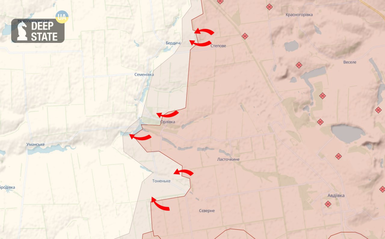 Идут бои в восточной части Орловки и южнее россияне атакуют с флангов Тоненькое. Но там контратакуют ВСУ, выбив российские силы из ряда строений.