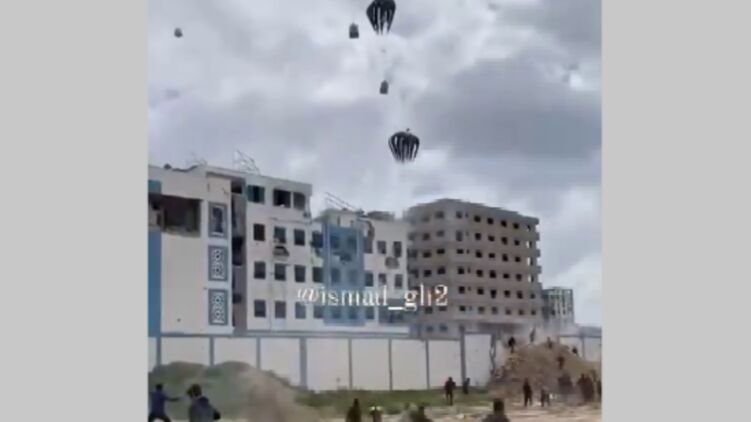 Это были грузы от Египта и США. На видео можно заметить, что некоторые парашюты не раскрылись. Ящики с помощью падали прямо на толпу.