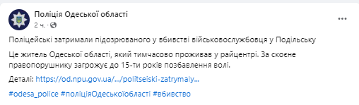 Полиция Одесской области задержала подозреваемого в жестоком убийстве военного, чье тело нашли на улице. Он проживал в городе Подольске и сознался в преступлении. Задержанному грозит до 15 лет лишения свободы.