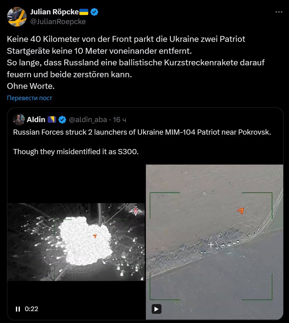 "Менее чем в 40 километрах от линии фронта Украина размещает две пусковые установки Пэтриот на расстоянии менее 10 метров друг от друга. Достаточно для того, чтобы Россия могла запустить по ним баллистическую ракету малой дальности и уничтожить обе", - написал журналист Bild Юлиан Рёпке.