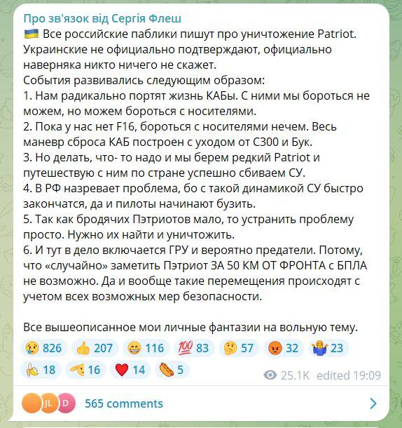 Также предполагают и украинские эксперты. Они отмечают, что для борьбы с российскими самолетами, которые сбрасывают КАБы, системы ПВО ВСУ вынуждены перемещать к линии фронта из-за чего они попадают в зону поражения. Также эксперты не исключают фактора предательства. То есть кто-то из украинских военных, по этой версии, известил россиян о маршруте передвижения "Пэтриота".