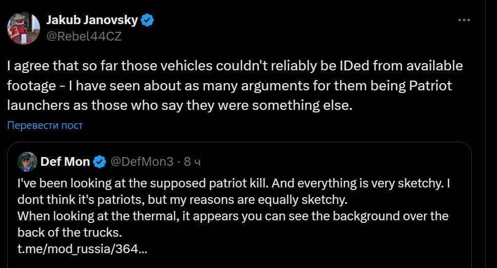 А вот OSINT-аналитик DefMon не видит на опубликованных Россией кадрах взрыва убедительных данных о поражении "Пэтриота".