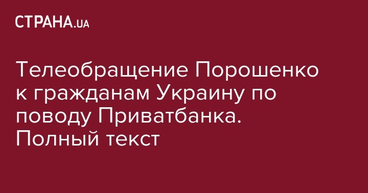 "Страна" публикует полный текст сегодняшнего телеобращения президента Петра Порошенко в связи с национализацией Приватбанка, которое размещено на официальном сайте президента.