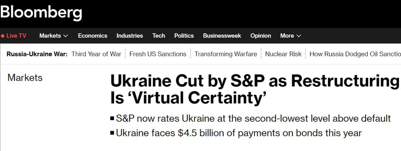 "Мы ожидаем, что в краткосрочной перспективе украинское правительство начнет официальные переговоры о реструктуризации долга с частными кредиторами и завершит этот процесс к середине текущего года. Мы считаем практически несомненным, что Украина объявит дефолт по своим внешним коммерческим обязательствам", — пояснили в S&P Global Ratings.