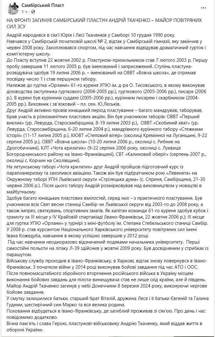 Заявляется, что их бывший выпускник погиб 8 марта в чине майора авиации. Он был родом из города Самбор Львовской области.