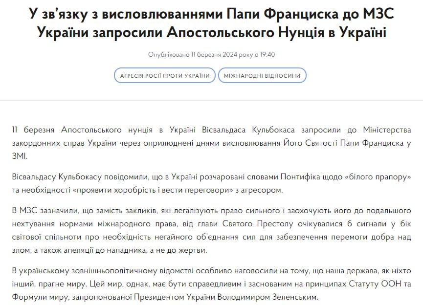 Висвальдасу Кульбокасу сообщили, что "в Украине разочарованы словами понтифика о "белом флаге" и необходимости "проявить храбрость и вести переговоры" с агрессором".