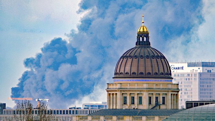 На кадрах столб плотного чёрного дыма поднимается над крышами размещённых на площадке построек. Фотография, сделанная за несколько кварталов от очага возгорания позволяет предположить, что пожар был виден из любой точки города.