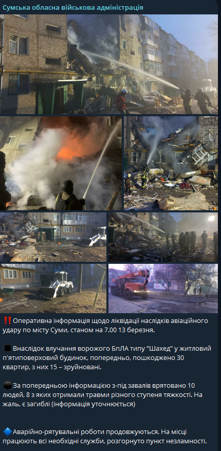 Ночью, 13 марта, российские военные с помощью БПЛА "Шахед" атаковали пятиэтажку в Сумах. Есть погибшие.