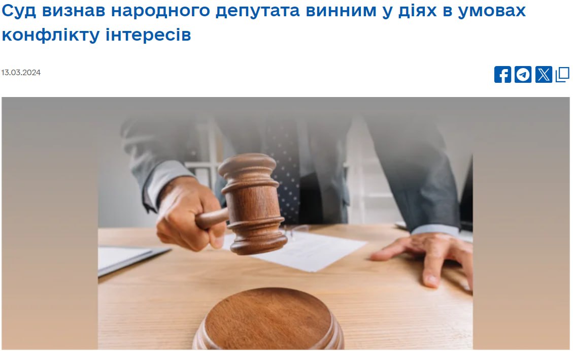 8 ноября 2023 года сотрудники НАПК вручили действующему народному депутату протокол об административном правонарушении, связанном с коррупцией (ч. 2 ст. 172-7 КУоАП – нарушение требований по предотвращению и урегулированию конфликта интересов).