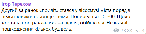 По словам Терехова, второе за утро попадание в Харькове зафиксировали в лесополосе рядом с нежилыми помещениями. Обошлось без пострадавших, незначительно повреждены несколько построек.