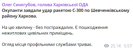 "Войска РФ около 05:10 нанесли удар ракетой С-300 по Шевченковскому району Харькова", - сообщил Синегубов.