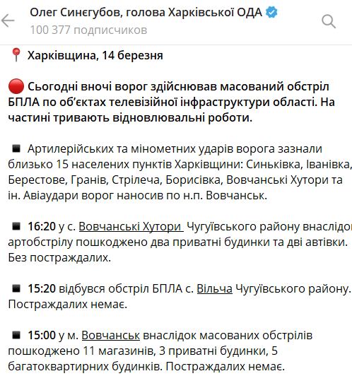 Ночью 14 марта россияне атаковали беспилотниками объекты телевизионной инфраструктуры Харьковской области.
