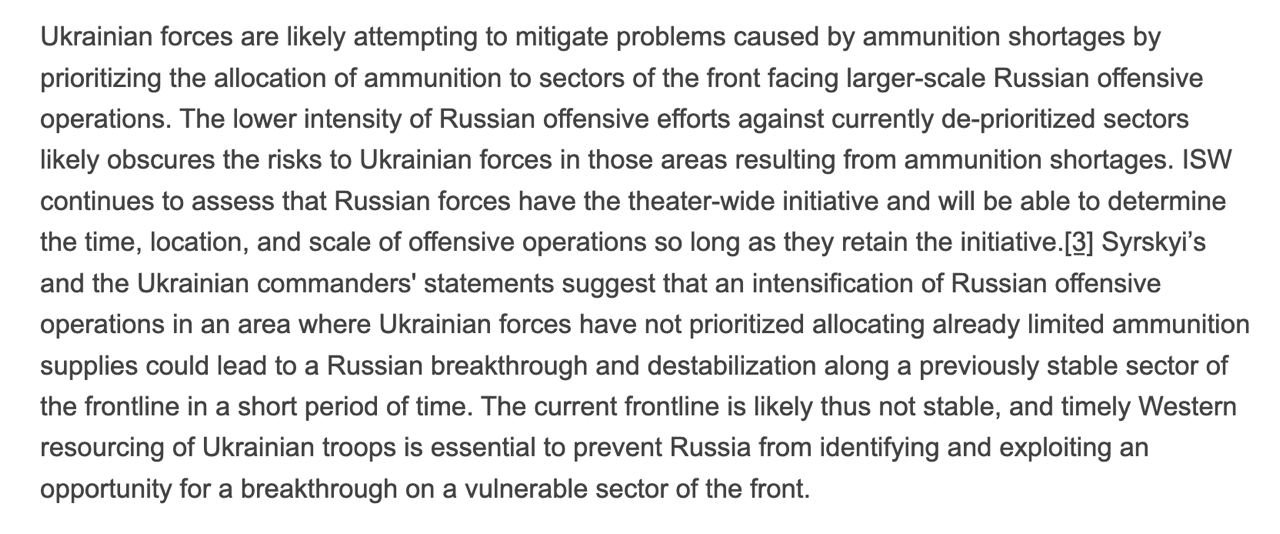 Аналитики считают, что нынешняя линия фронта, "скорее всего, нестабильна", и важно снабдить Украину снарядами, "чтобы не дать России выявить и использовать возможность прорыва на уязвимом участке фронта".