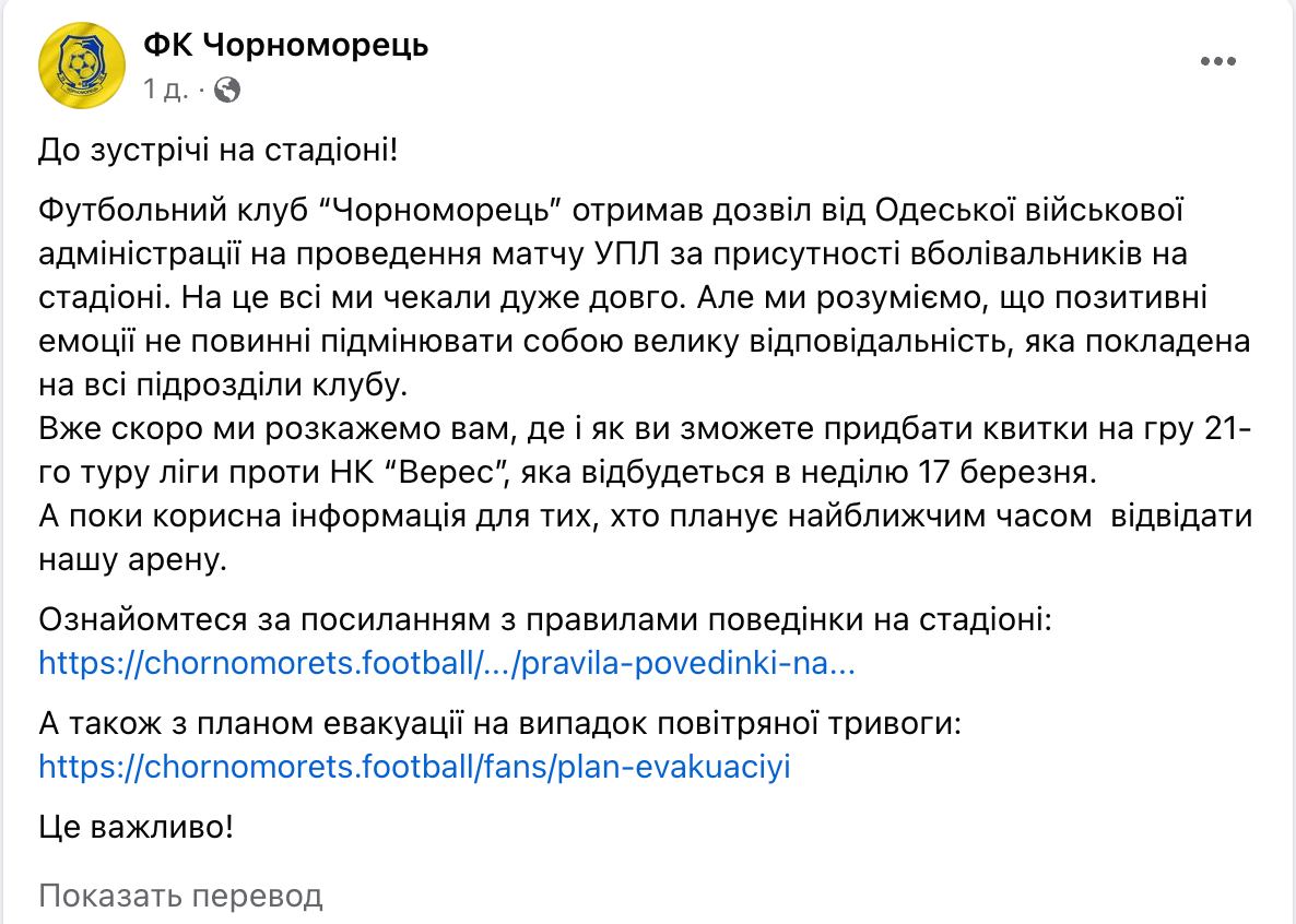 Вчера, 13 марта, руководство клуба сообщило на своей странице в Фейсбуке, что получило от ОВА разрешение провести матч с "Вересом" 17 марта в присутствии зрителей. На стадион планировали пустить 1,5-2 тыс. человек.