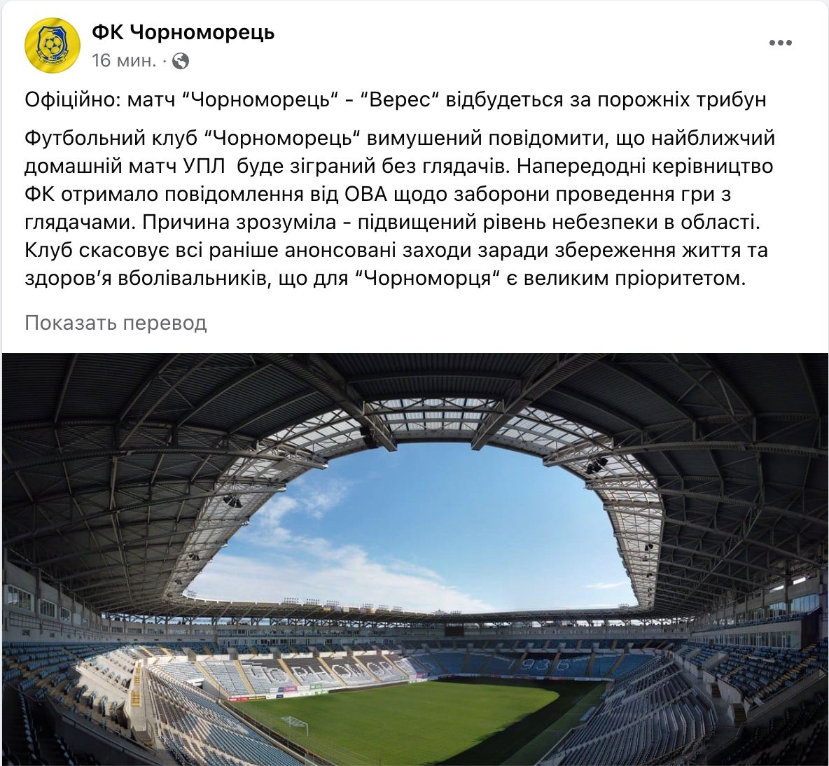 В Одессе разрешили пустить зрителей на футбольный матч местного клуба "Черноморец", но после возмущения в сети областная военная администрация (ОВА) отменила свое же решение.