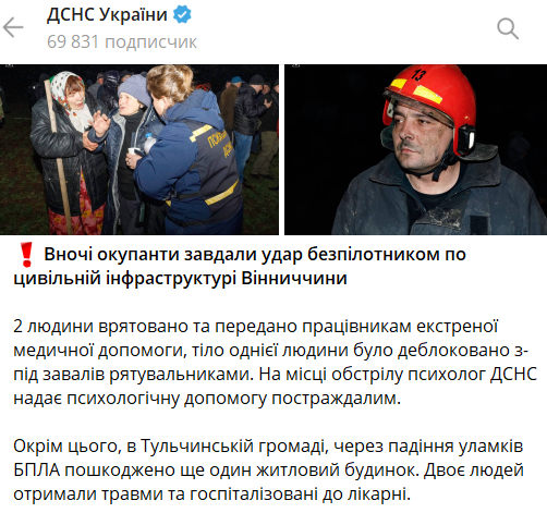 Кроме того, в Тульчинской общине из-за падения обломков дрона поврежден еще один жилой дом. Два человека получили травмы и госпитализированы в больницу.