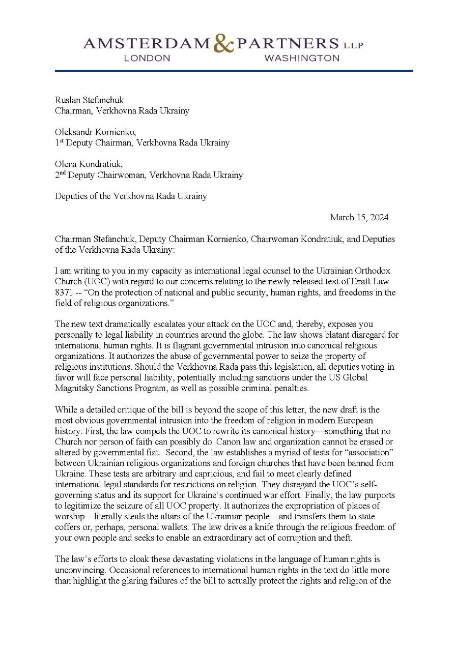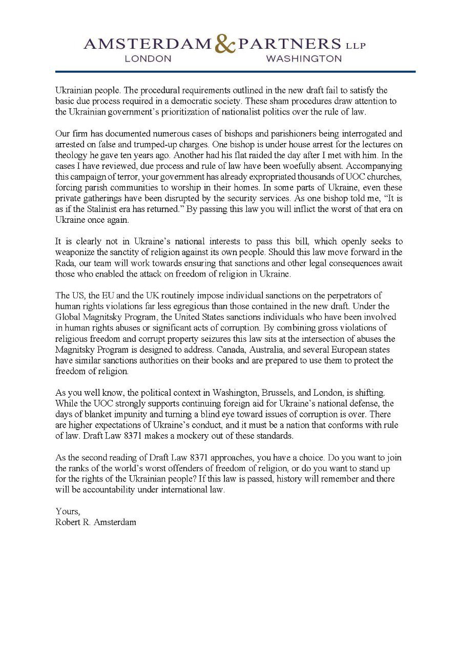 Об этом написал в своем обращении к спикеру парламента и нардепам адвокат УПЦ Роберт Амстердам.
