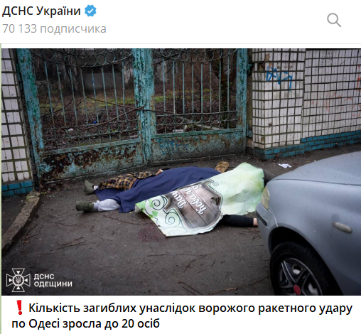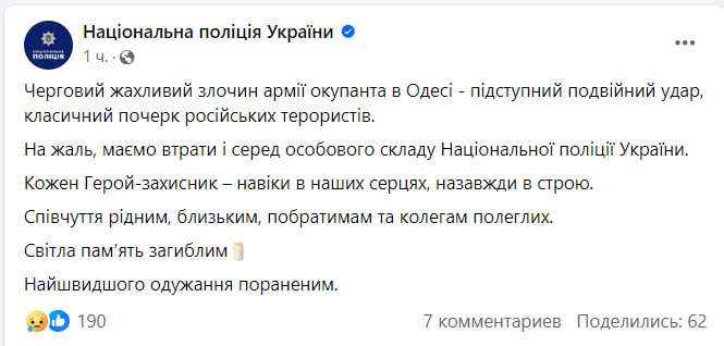 В свою очередь Нацполиция информирует, что среди погибших сегодня от удара по Одессе есть полицейские.