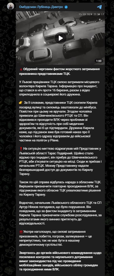 "По этому делу состоялось совещание с областным ТЦК. Решили назначить повторное прохождение ВВК, по итогам которого областной ТЦК будет принимать решение по Кириллу Тарану", - написал Лубинец.