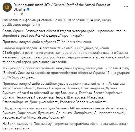 Утром 18 марта Генштаб ВСУ обнародовал сводку о ситуации на фонте за минувшие сутки.
