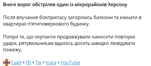 "Несмотря на то, что оккупанты продолжали наносить повторные удары, спасателям удалось довольно быстро ликвидировать пожар", - заявили в ГСЧС.