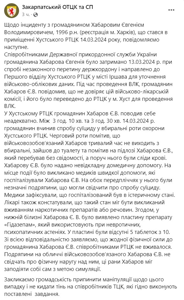 Закарпатский ТЦК опубликовал свою версию попытки самоубийства мужчины в военкомате Хуста: его никто не бил, он сам был неадекватен и мог иметь психические проблемы, из-за которых употреблял "Гидазепам".