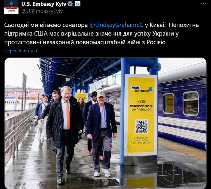 "Сегодня мы поздравляем сенатора Линдси Грэма в Киеве. Непреклонная поддержка США имеет решающее значение для успеха Украины в противостоянии незаконной полномасштабной войне с россией", - говорится в сообщении.