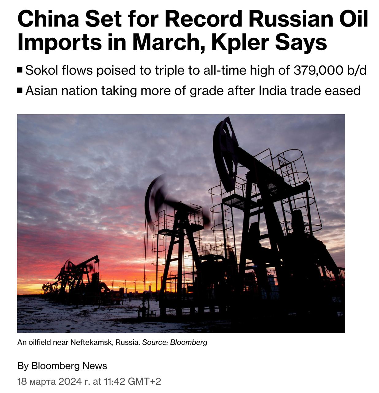 Китай в марте выходит на рекордный импорт российской нефти. Об этом сообщает Bloomberg.
