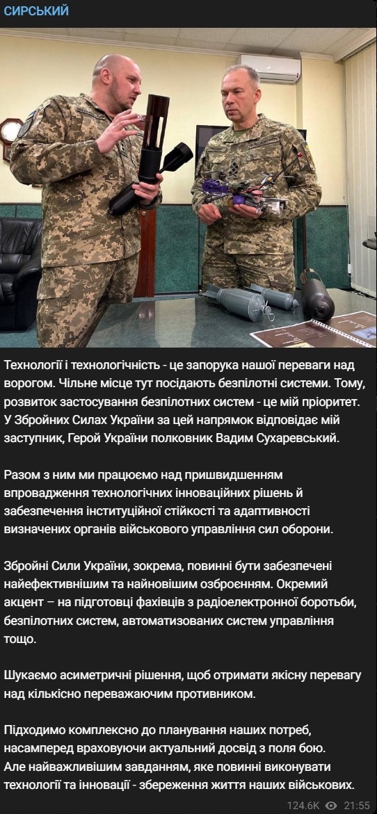 "Технологии и технологичность – это залог нашего превосходства над врагом. Ведущее место здесь занимают беспилотные системы. Поэтому развитие применения беспилотных систем – это мой приоритет", - написал он.
