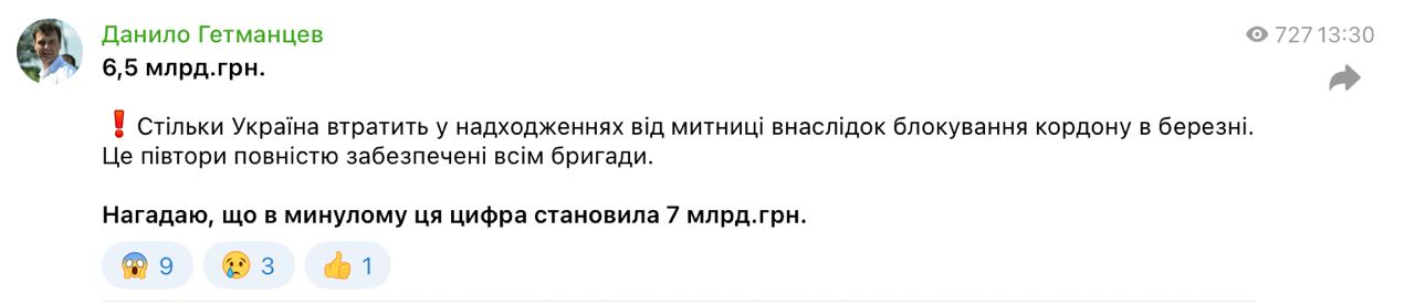 Ранее нардеп Ярослав Железняк сообщал, что за февраль Украина потеряла 8 млрд грн из-за блокады украинской продукции на польских границах.