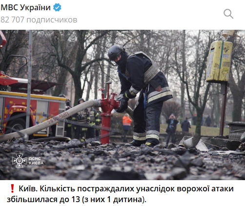 "Киев. Количество пострадавших в результате вражеской атаки увеличилось до 13 (из них 1 ребенок)", - говорится в сообщении.
