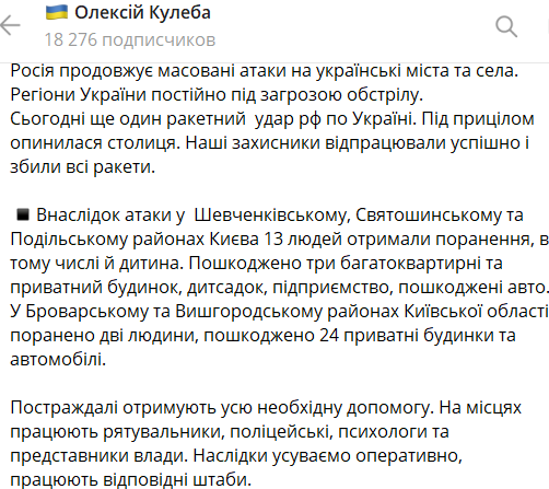Между тем, по данным МВД, число пострадавших в Киеве после массированной ракетной атаки РФ увеличилось до 13 человек. Среди них и ребенок.