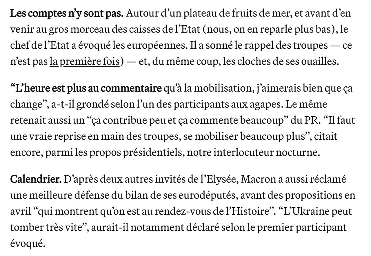 "Это скорее время для комментариев, чем для мобилизации, и мне бы очень хотелось, чтобы ситуация изменилась. Нам нужно действительно вернуть войска в нужное русло и мобилизовать их гораздо больше", - заявил президент Франции "за блюдом из морепродуктов", пишет издание.