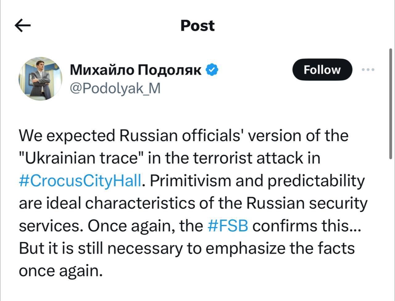 Советник главы Офиса президента Михаил Подоляк отрицает причастность Украины к теракту, о которой заявляла ФСБ. Заявил, что Украина "ожидала версии российских чиновников об "украинском следе" теракта в Крокус Сити Холл".