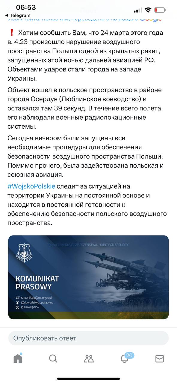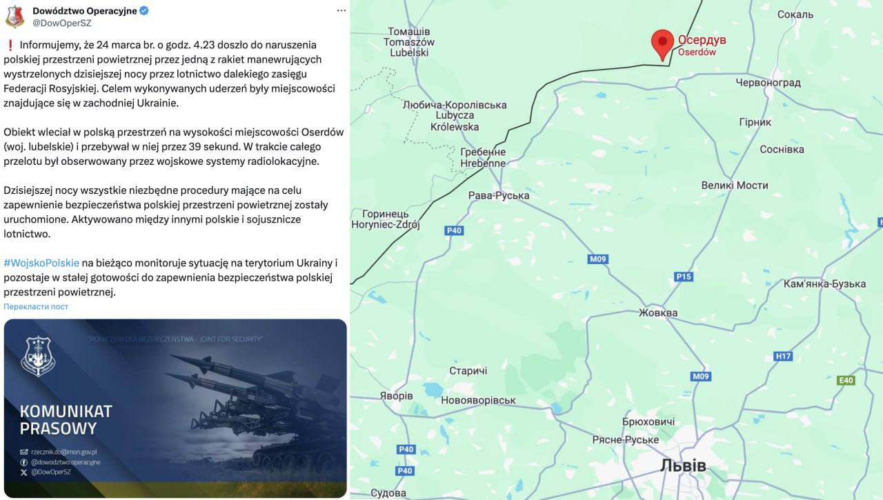 07:58 Одна из российских ракет во время сегодняшней ночной атаки на западную Украину зашла на 39 секунд в воздушное пространство Польши около города Осердув.
