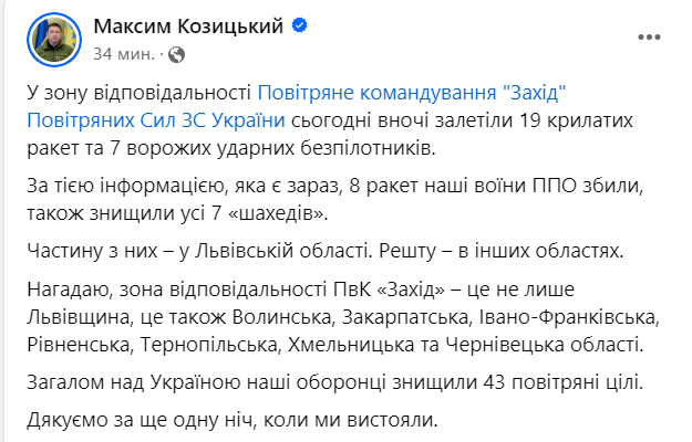 Глава Львовской ОВА Максим Козицкий сообщил, что в зону ответственности Воздушного командования "Запад" сегодня ночью залетели 19 крылатых ракет и 7 вражеских ударных беспилотников.