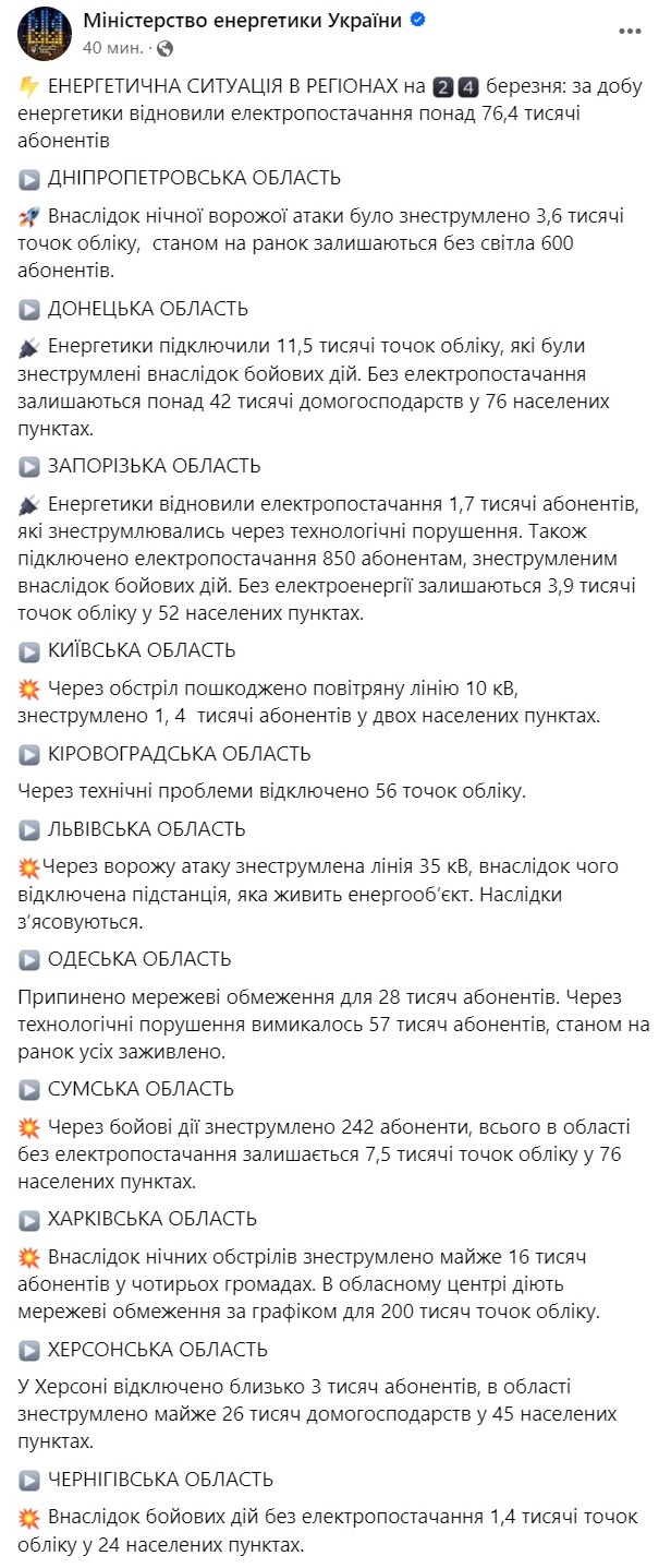 Ситуация в энергетике после российских обстрелов марта остается непростой. В Харькове после российского удара 22 марта перебои со светом остаются у 200 тысяч абонентов.