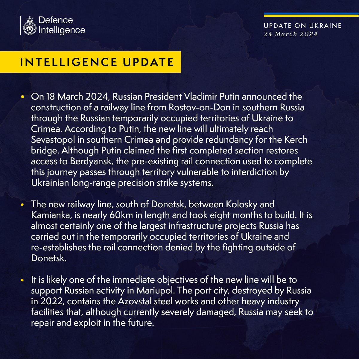 Владимир Путин 18 марта объявил о планах построить железнодорожную ветвь от Ростова-на-Дону на юге России через временно оккупированные территории Украины в Крыму. По его утверждению, первый участок железной дороги восстанавливает доступ в Бердянск.
