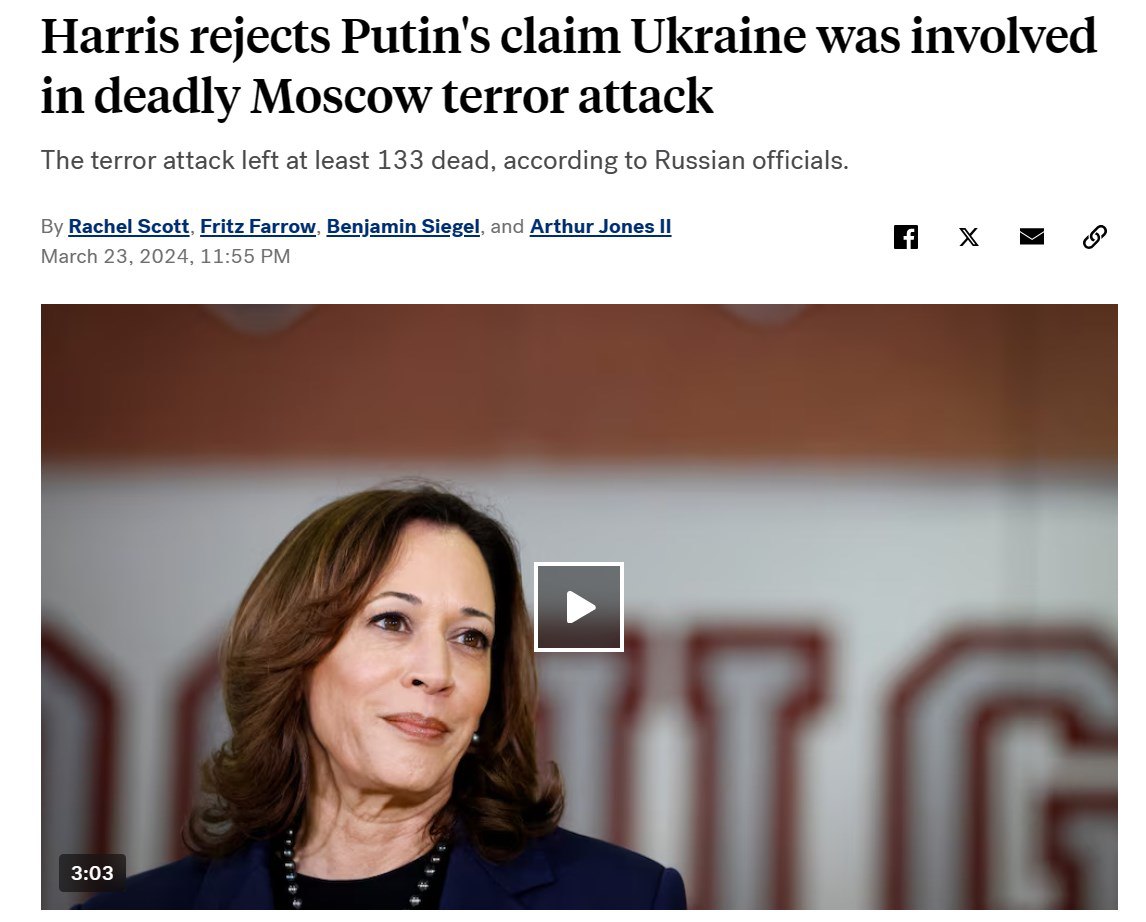 "Нет, нет никаких доказательств (участия Украины - Ред.), и на самом деле то, что мы знаем, это то, что ИГИЛ-K фактически, по всем признакам, несет ответственность за то, что произошло", - заявила Харрис.