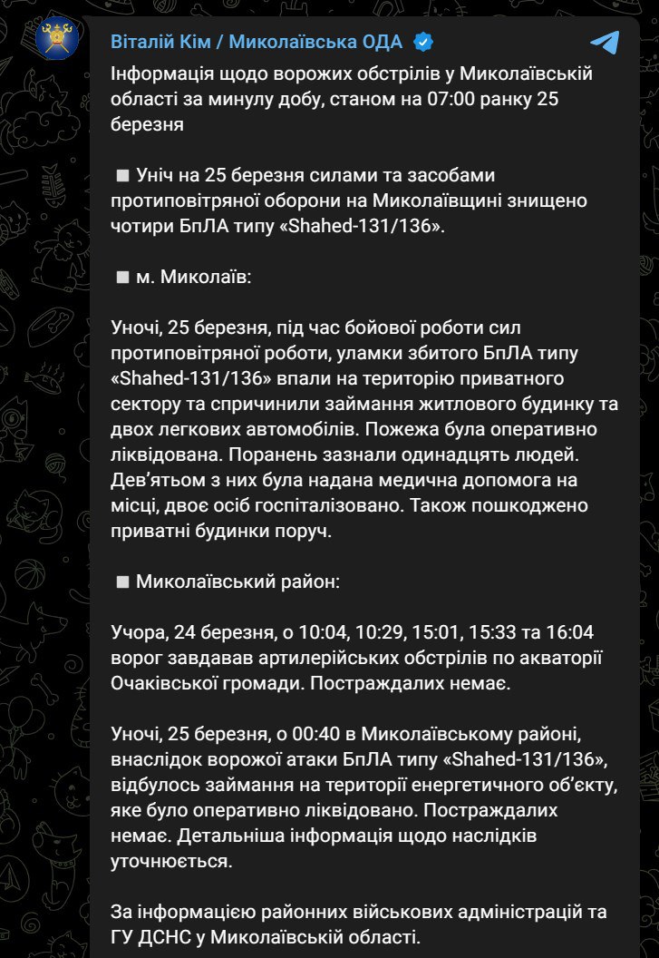 Под Николаевом 25 марта "Шахед" ударил по объекту энергетики.
