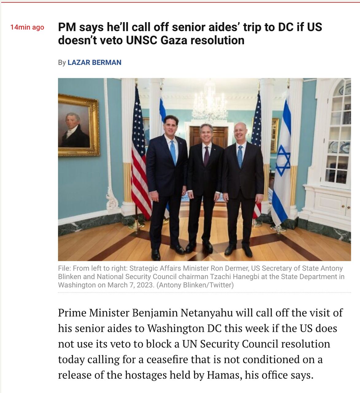 Незадолго до заседания Совбеза премьер-министр Израиля Биньямин Нетаньяху пригрозил отменить поездку израильской делегации в Вашингтон, если США не наложат вето на сегодняшнюю резолюцию.