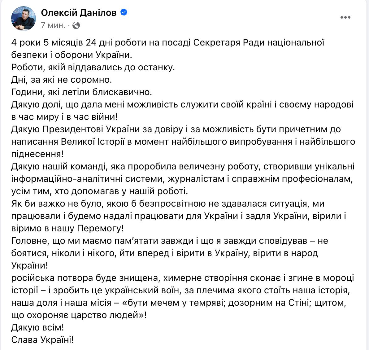 "4 года 5 месяцев 24 дня работы в должности секретаря Совета национальной безопасности и обороны Украины. Работы, которой отдавались без остатка. Дни, за которые не стыдно. Часы, которые летели молниеносно. Спасибо судьбе, что дала мне возможность служить своей стране и своему народу во время мира и во время войны!" - написал Данилов.