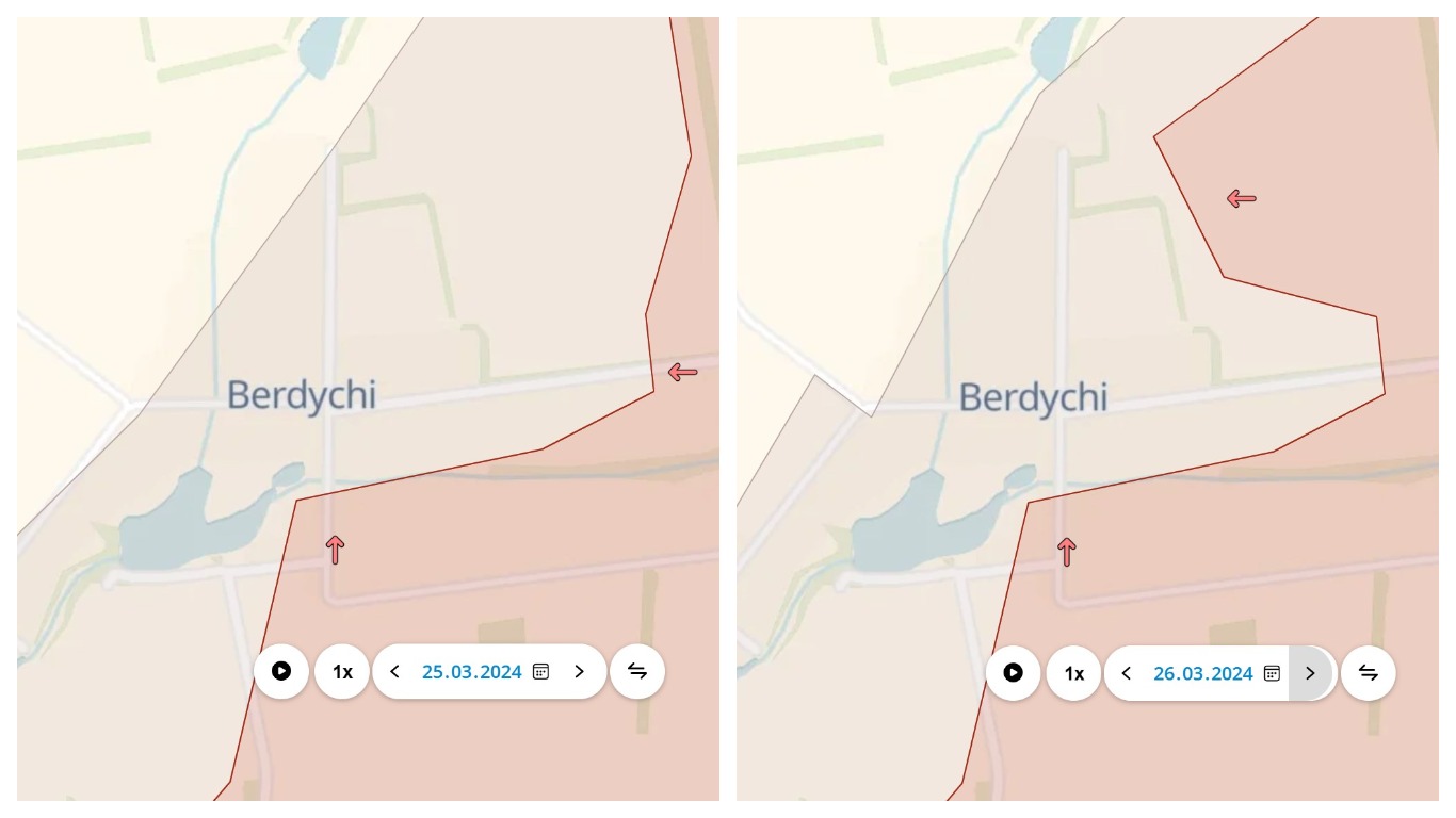О продвижении к северу от Бердычей сообщали сегодня с утра и российские военные телеграм-каналы.