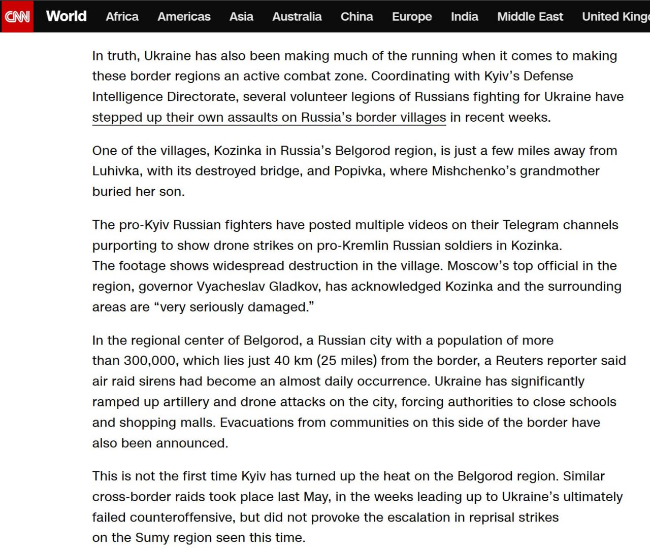 "Киев уже не первый раз нападает на Белгородскую область. Подобные трансграничные рейды имели место в мае прошлого года, за несколько недель до неудачного контрнаступления Украины. Но они не спровоцировали эскалацию ответных ударов по Сумской области, наблюдавшуюся на этот раз", - пишет CNN.