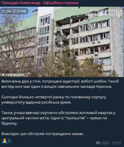 "Огромная дыра в стене, разбитые аудитории, выбитые стекла. Так выглядит сейчас одно из высших учебных заведений Херсона", - написал глава ОВА.