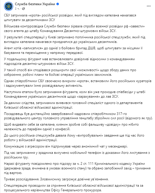 СБУ заявляет о задержании военного капеллана и по совместительству чиновника Киевской ОВА, подозреваемого в работе на РФ.