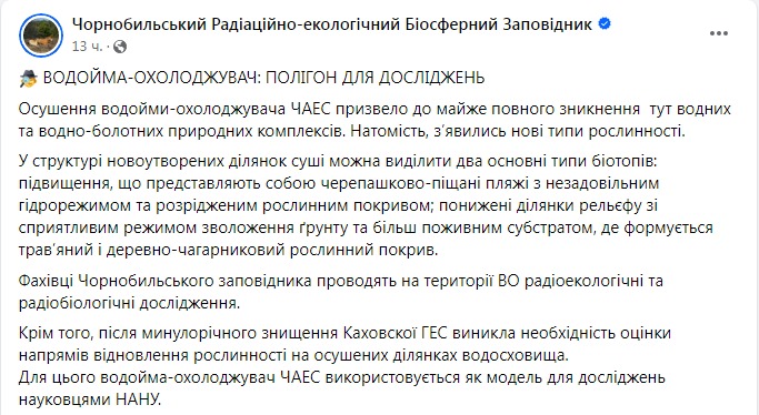 Осушение водоема-охладителя ЧАЭС привело к почти полному исчезновению водных и водно-болотных природных комплексов. Вместо этого появились новые типы растительности.