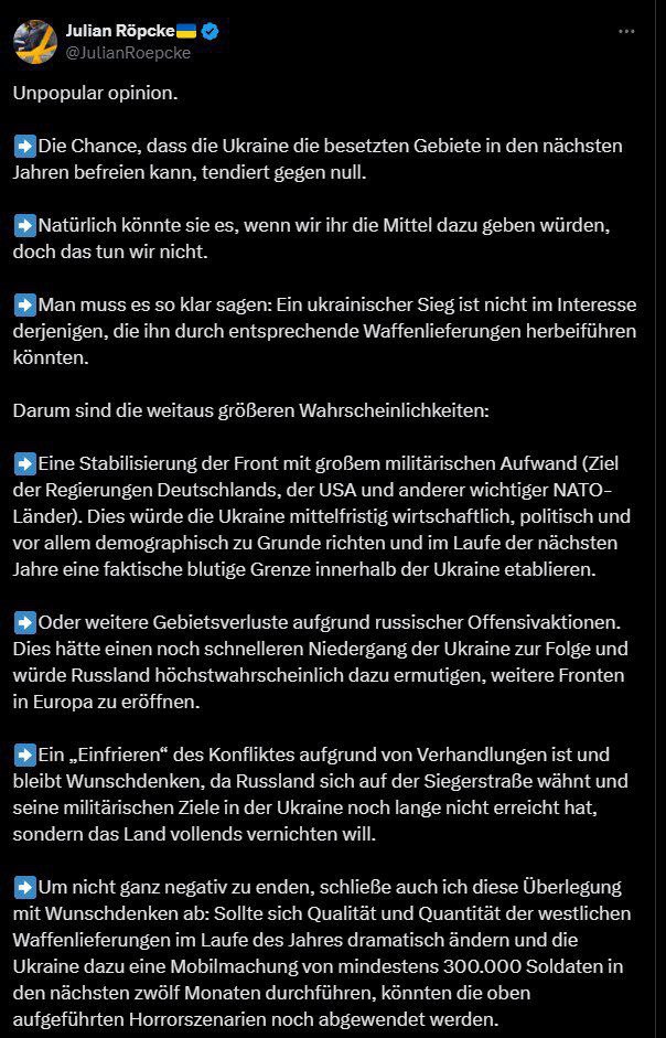 По мнению Репке, эти сценарии еще можно предотвратить, "если качество и количество западных поставок оружия резко изменятся в течение года, и Украина мобилизует не менее 300 000 солдат в следующие двенадцать месяцев".
